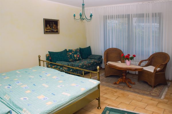 Tagsüber stehen Ihnen auch unser Aufenthalts-/Frühstücksraum sowie die sonnige Liegewiese zur Verfügung.